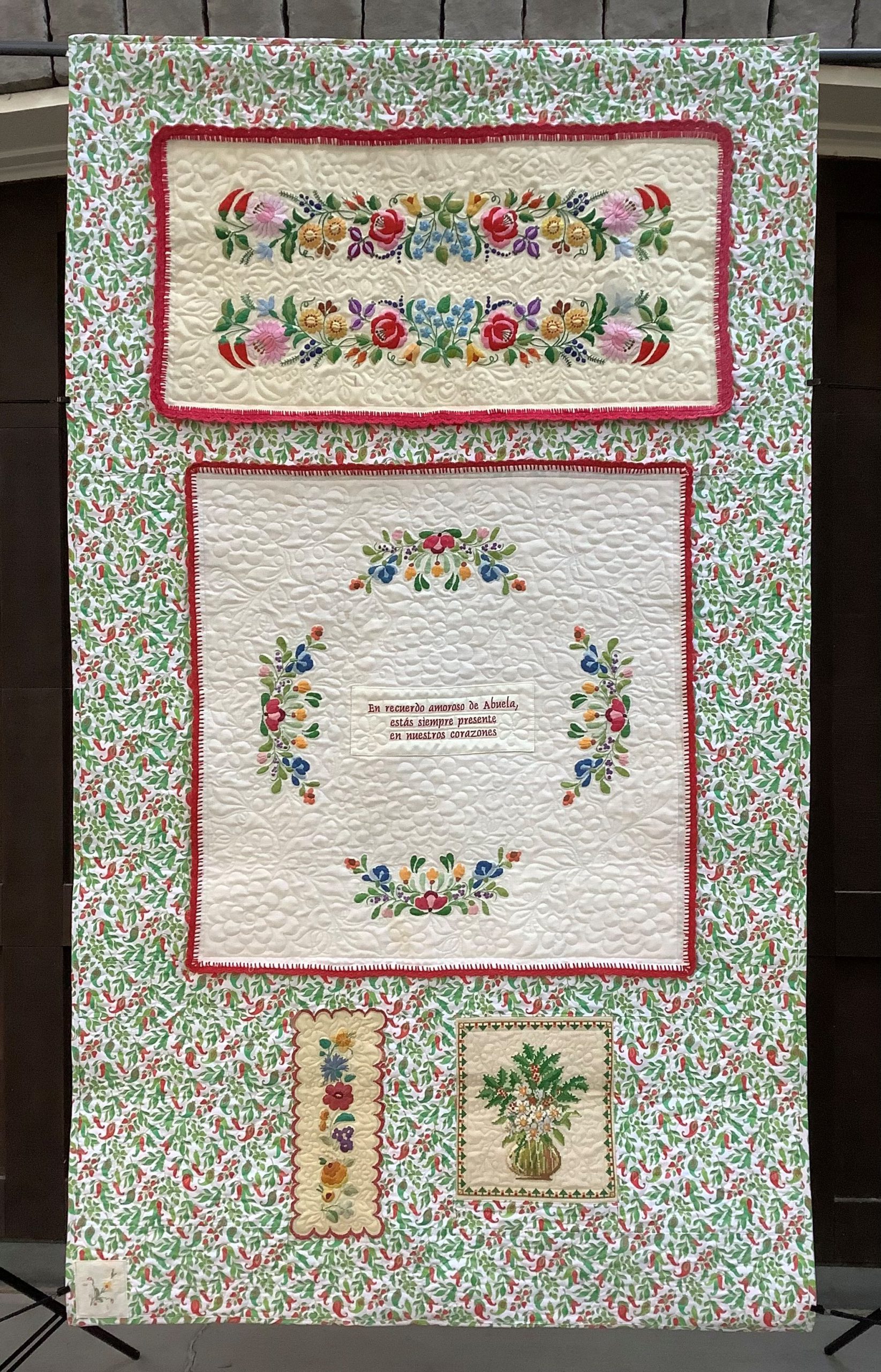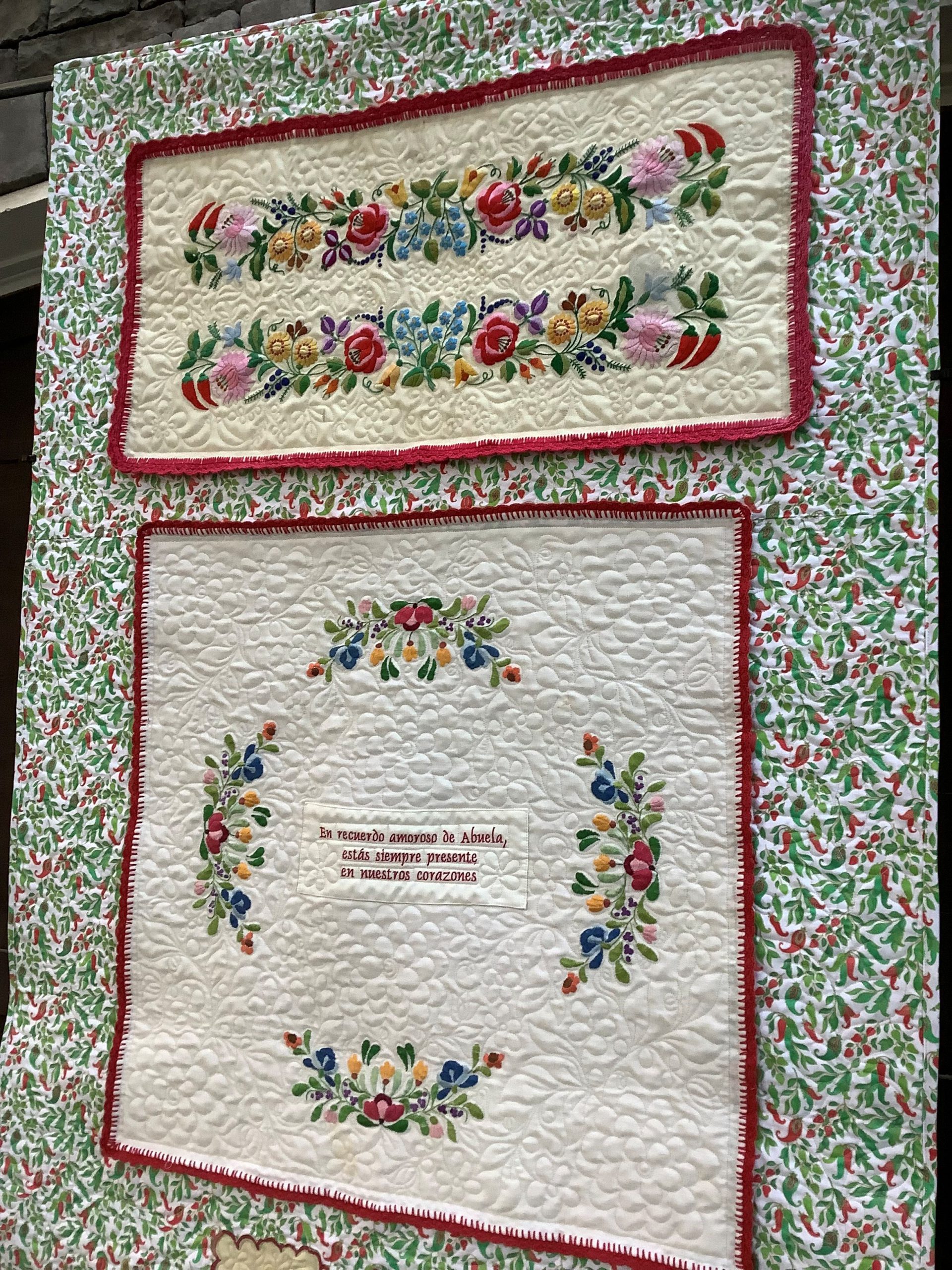 This custom quilt was made with a beloved grandmother in mind. Grandma had lovingly made the embroidery pieces that are on the top of this quilt. The chili pepper print honors grandmother’s Hungarian lineage.