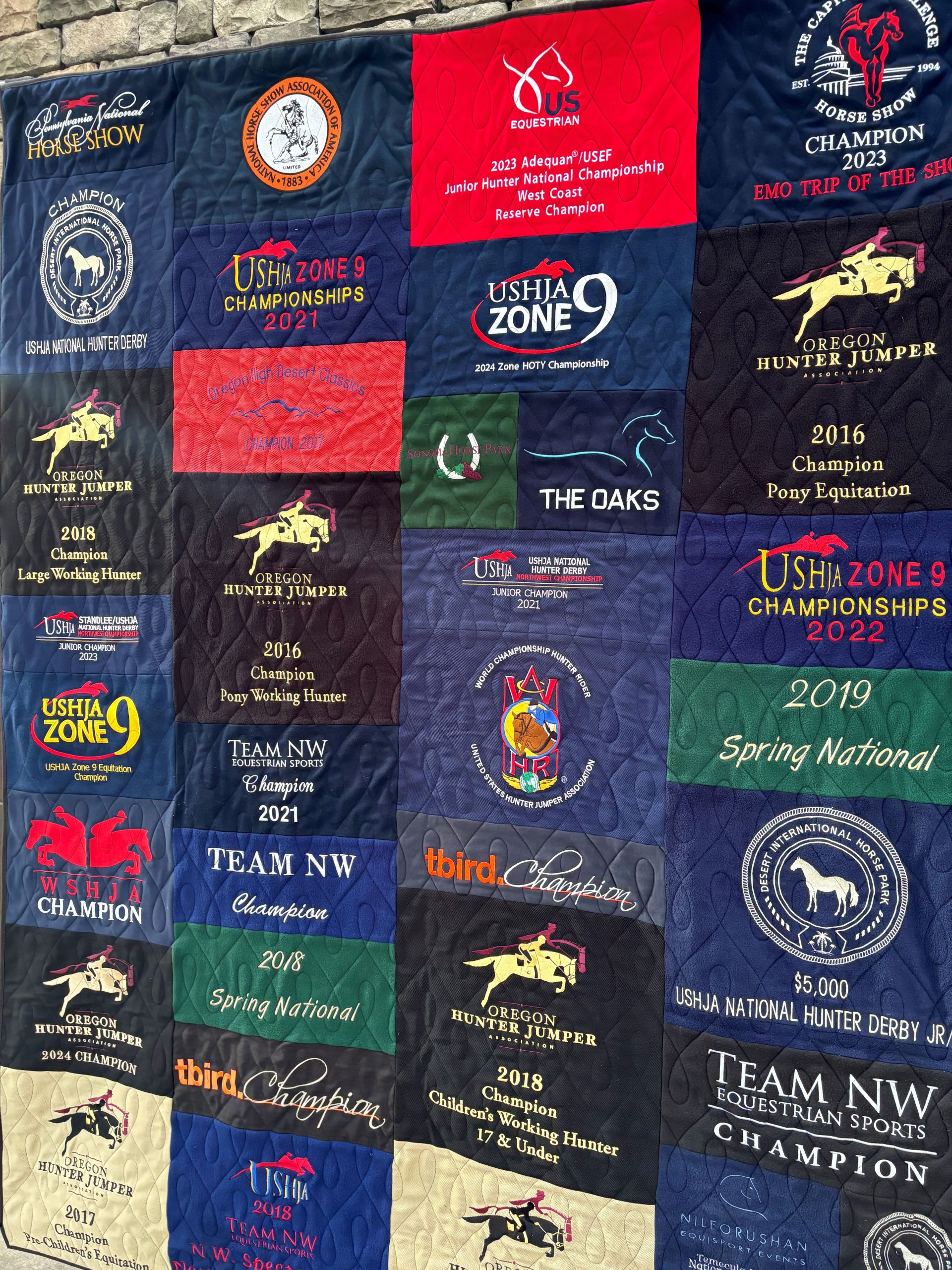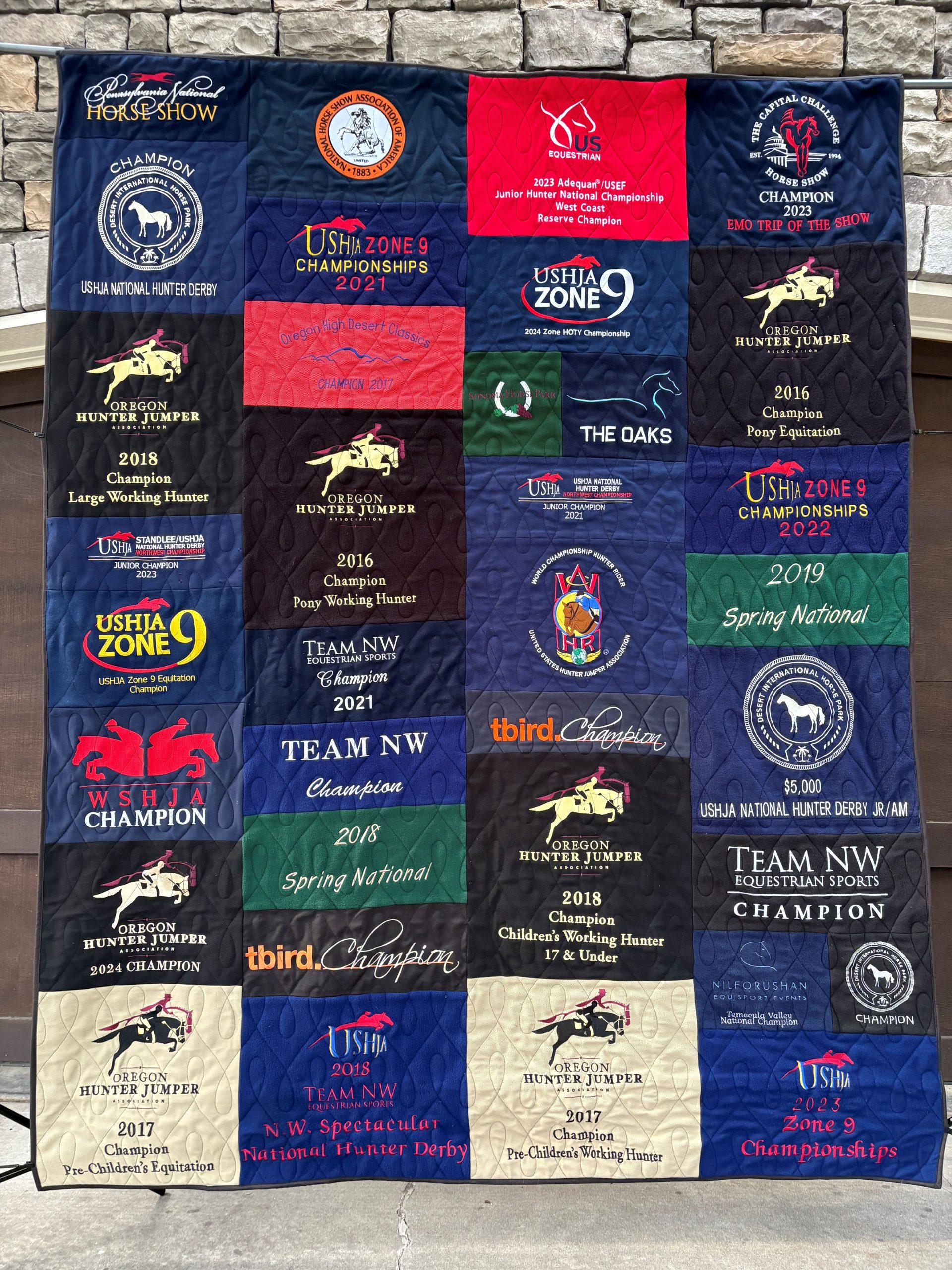 This unique quilt is crafted from horse blankets awarded at Hunter Jumper competitions. I’m deeply humbled to have made this quilt for a champion rider.